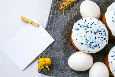 Easter eggs. Happy Day Bright Easter. Orthodox Easter holiday. Traditional food. Creative stylish trend Homemade easter cake. Copy space sheet paper