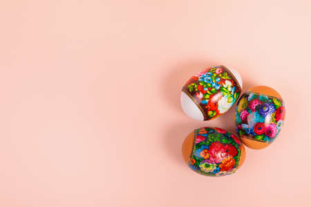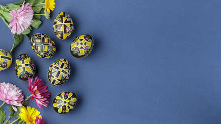 Ukrainian Easter eggs decorated with wax-resist dyeing technique, traditional for Eastern European countries, wide format, top view, copy space