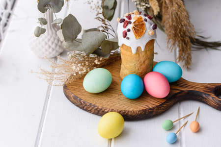traditional easter cake kulich Ukrainian Russian with colored eggs on blue wooden background