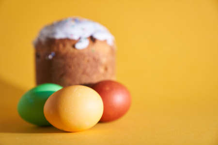 Colored Easter eggs on the background of an Easter cake. Yellow background with space to copy. High quality photo