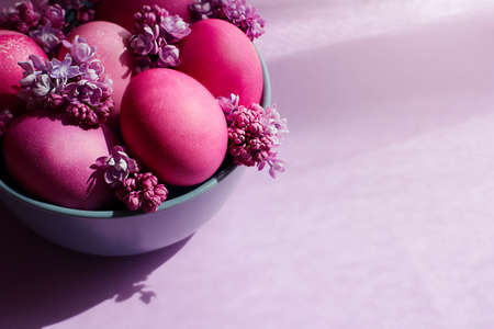 A gray bowl with bright pink Easter eggs and lilac flowers on a purple background. easter decor. selective focus.