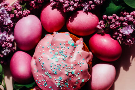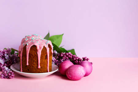 Traditional Easter cake with decorative glaze. Orthodox food after fasting on the Easter holiday. Red-painted chicken eggs on a light tablecloth