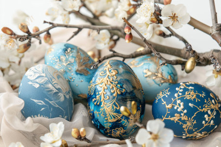 Blue easter eggs and spring blossom branch on white background.