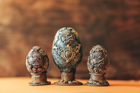 Three Easter Eggs with stripped Pattern on cozy warm brown color textile background. AI generative