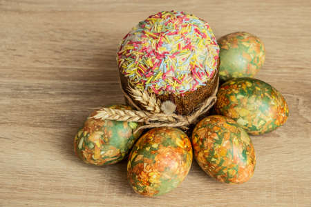 Beautiful Easter composition - colorful eggs, Easter cake, ears of wheat, traditionally elegant.