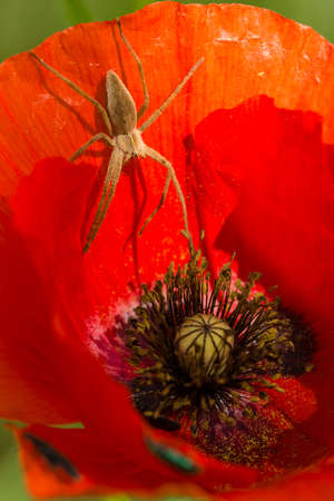 Meadow spider in its natural environment. A meadow spider on the flower of a meadow plant in its natural environment.