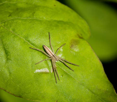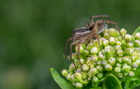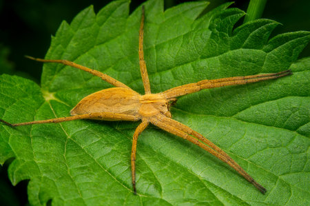 Macrophotography of a Nursery Web Spider (Pisaura mira) on a green leaf in nature.