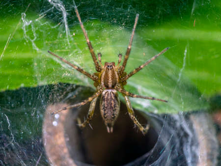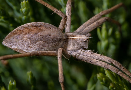 Macrophotography of a Nursery Web Spider (Pisaura mirabilis). Extremely close-up and details.