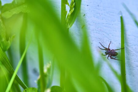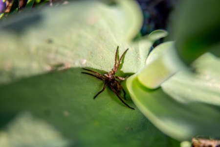 Wolfspider on a green fern leaf. Poison insects macro shot.