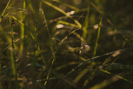 A mosquito sitting on a blade of grass in the light of the setting sun