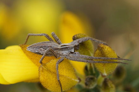 Natural closeup on a Nursery web spider, Pisaura mirabilis on top of a yellow Common gorse flower