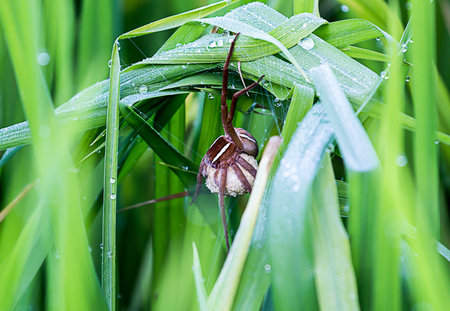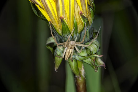 Pisaurina mira Nursery web spider a common garden and meadow insect with selective focus.