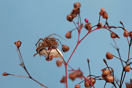 Macro spider (Pisaura mirabilis) on its white spheric cocoon