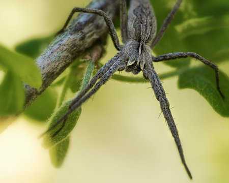 Macrophotography of a Nursery Web Spider (Pisaura mirabilis). Extremely close-up and details.