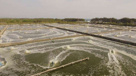 shrimp, prawn farming with with aerator pump for oxygenation water. Shrimp farms aerial view aquaculture business exported international market. java, indonesia