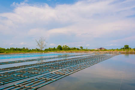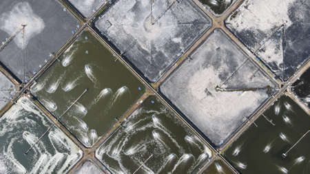 Aerial view of natural sea salt ponds, lake or sea. Farm field outdoor in traditional industry in Thailand. Asia culture. Agriculture irrigation. River reflection.