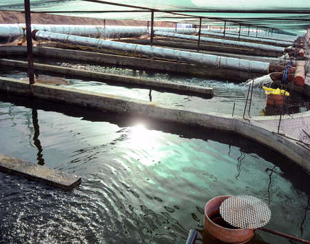 Tanks outdoors of farm for industrial breeding sturgeon fish.