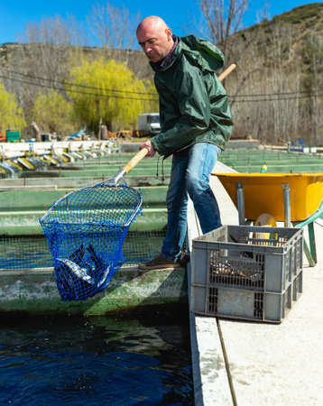 A worker places fish in the tanks of a fish farm. A trout breeding and rearing farm.