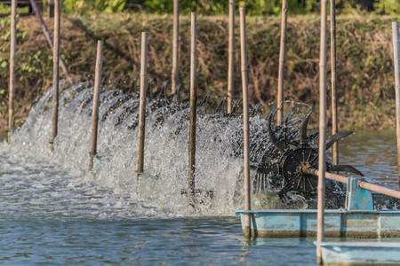 Red tilapia farm pond with a waterwheel system for circulating water and oxygen in an artificial pond where the water is very clear