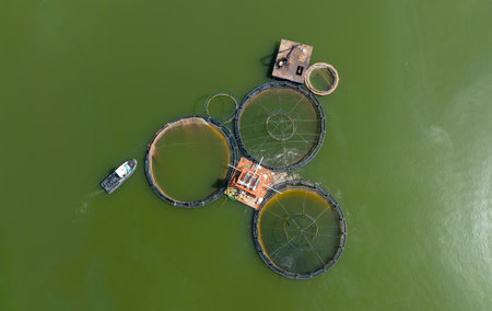 Captivating Aerial Perspective of Thriving Salmon Fish Farm in Aquaculture Oasis