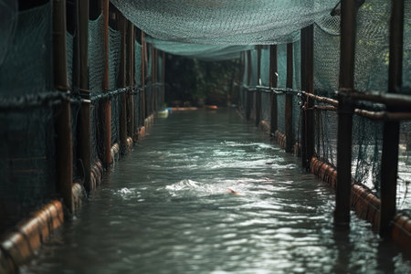 An extensive collection of fish cages floats effortlessly on the surface of a vast body of water, fish farm farming with nets, AI Generated