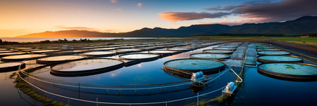 Fish Farming Facility With Aquaculture Tanks in a Bright Sunny Environment Showcasing Water Ripples and Reflections During Midday. Generative AI
