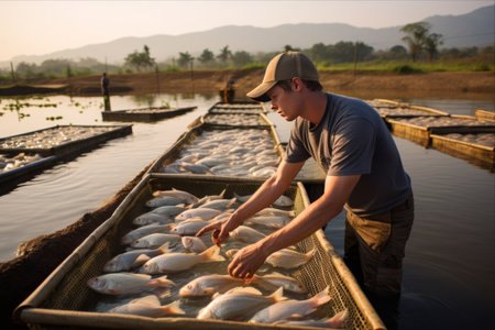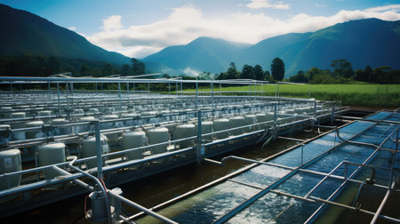 Fish farm. Freshwater fish that was raised in ponds and cages. Generative AI illustration