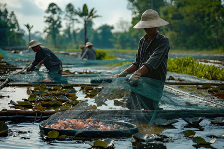 Workers wearing conical hats, harvesting prawns in a traditional shrimp farm in indonesia