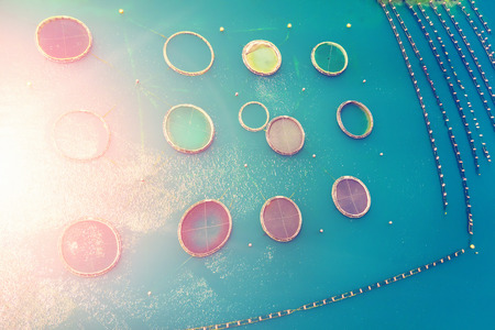 Top view at the round ponds encircled with net of fish farm in Adriatic sea