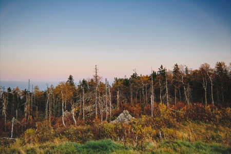 Autumn landscape view from the top of the mountain to the colorful autumn forest at sunset. Ural Mountains.