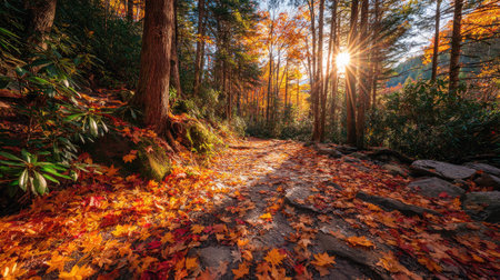 A serene forest road surrounded by trees with vibrant autumn colors, illuminated by sunlight.