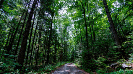 A path winds through a verdant forest, surrounded by tall trees and vibrant foliage. Sunlight filters through the canopy, creating a play of light and shadow. The composition focuses on the natural environment, likely suitable for illustrating themes of nature, travel, or environmental conservation, and various commercial purposes.