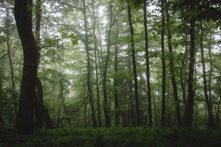 A green forest covered with fog