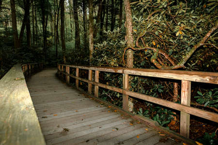 The quiet time of the plank road in the forest, the stairs to the depths of the forest