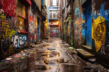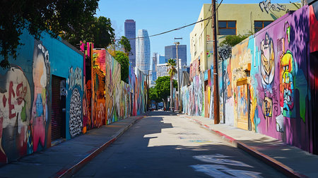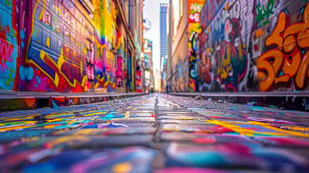 Urban alley with graffiti walls, bright daylight, street view, colorful and vibrant