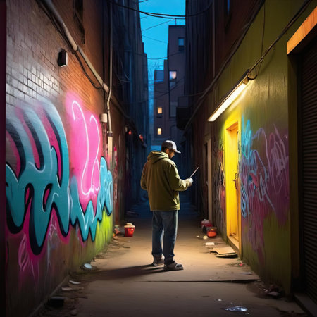 person, making graffiti art on brick wall in dark alleyway, created with generative ai