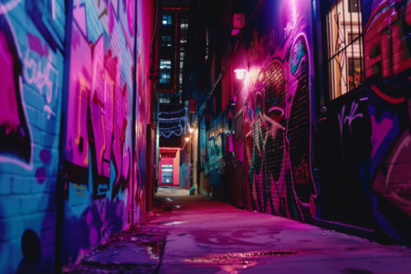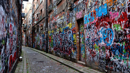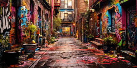 Vibrant Urban Graffiti Alley A dynamic street scene featuring bold, colorful graffiti adorning brick walls in a narrow urban alley
