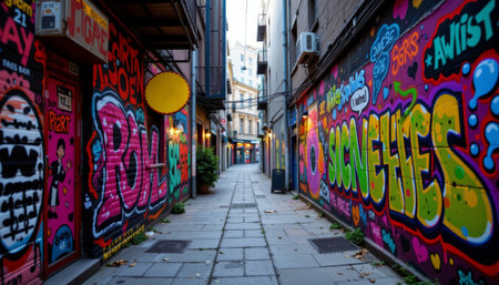 Colorful graffiti art covering the walls of an urban alley, showcasing street art and urban culture