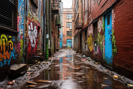 Captivating urban alleyway featuring striking graffiti and clean puddles reflecting nearby buildings, capturing the essence of city life after a summer rain.
