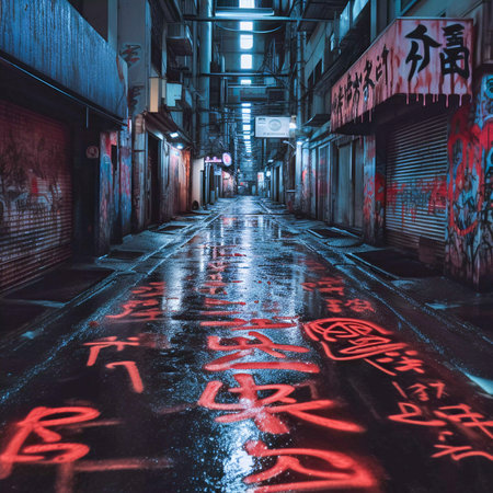 Dark alleyway with graffiti art. Underground city street with wall covered with graffiti in neon lights