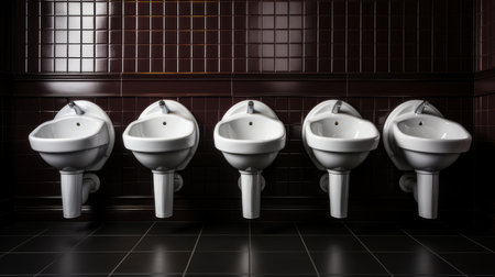 Interior of bathroom with sink basin faucet lined up and public toilet urinals, Modern bathroom design.