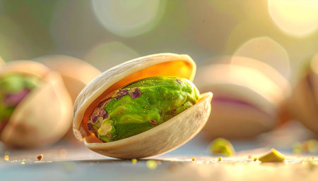 The image presents a close-up view of pistachio nuts, focusing on the rich textures and earthy color palette. The soft lighting enhances the natural details. AI generation