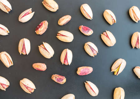Close-up of fresh pistachio nuts on a black background. Macro