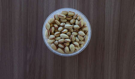 Plastic jar with pistachio nuts on the table.