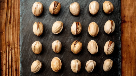 Open pistachio nuts scattered on dark surface