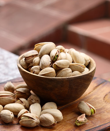 Pistachios nuts on wooden background. Pistachio is a healthy vegetarian protein nutritious food.