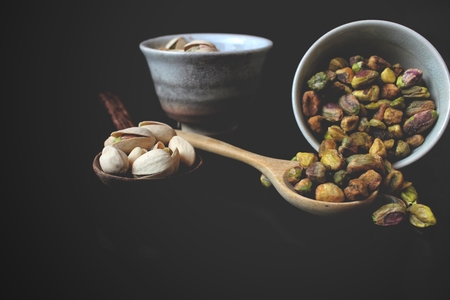 Still-Life with roasted and salted Pistachios served as a snack in bowl