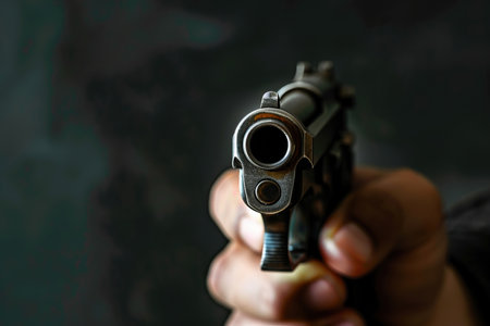 Hand with gun pointing forward close up