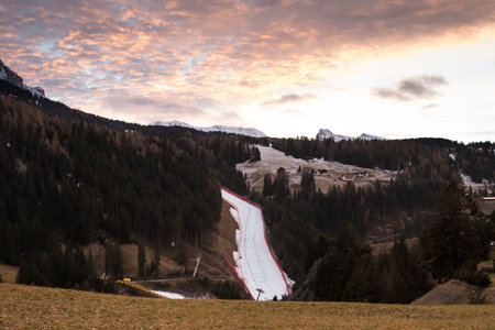 aerial view of ski resort with slopes copy space sunset