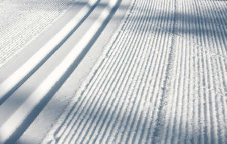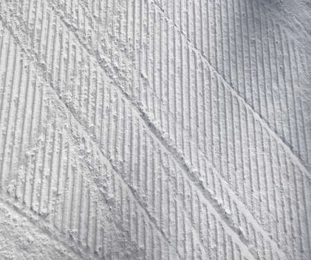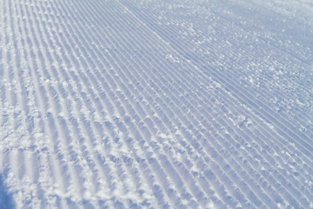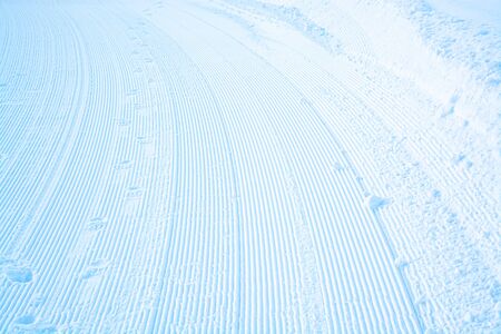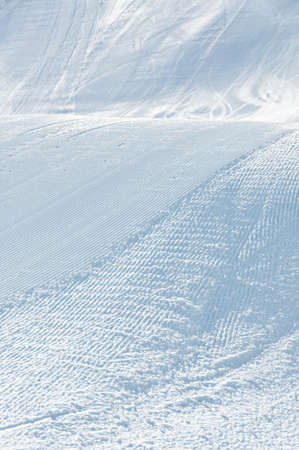 Relief trail in the snow after cleaning the ski slope with a snowcat. Grunge knurled snow background with ski slope